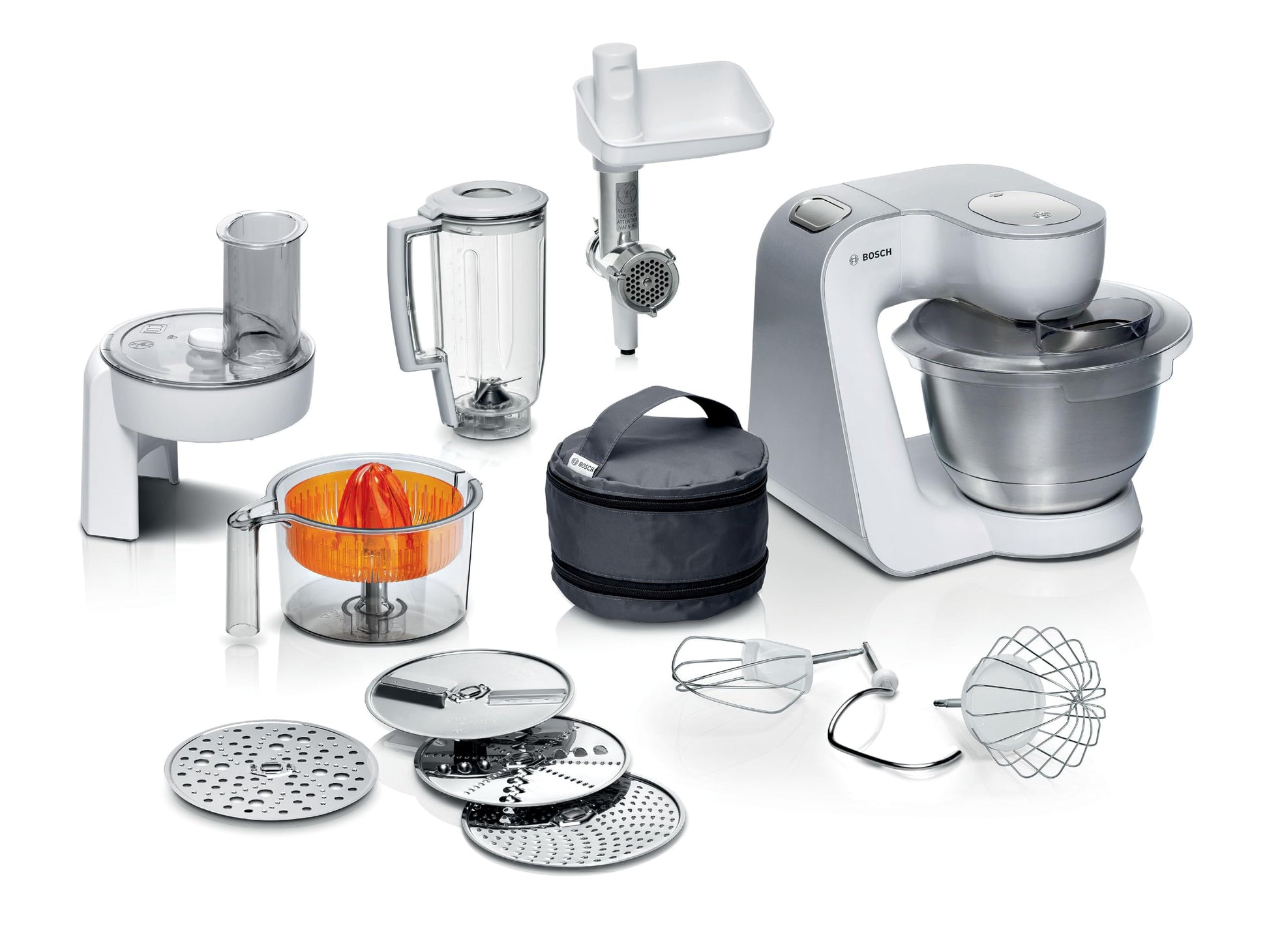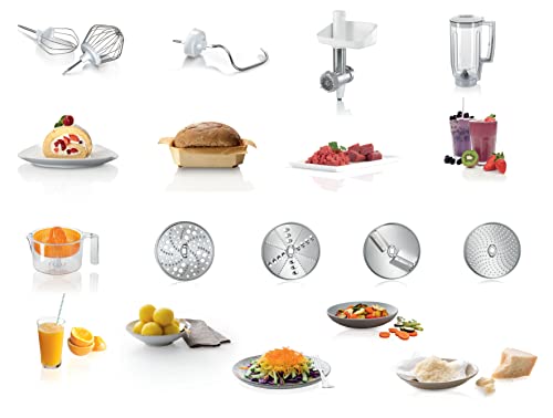 - ITEMS DELIVERED: Bosch MUM58259 with bowl, whisk with silicone edge, beating whisk, kneading hook, 1 litre blender, juicer, mincer, shredder attachment with 4 stainless steel discs, accessory bag, clear lid.