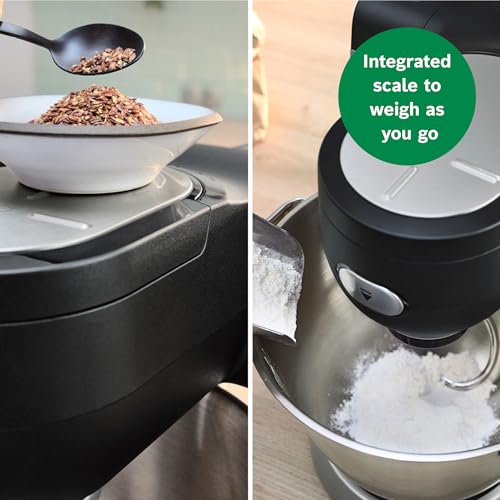 - INTEGRATED SCALE FOR PRECISE MEASUREMENTS: Weigh ingredients on top of the mixer or in the bowl with ease. The LED display shows the measurement to the exact gram, millilitres of oil or milk, and in pounds or ounces too, for optimal results.