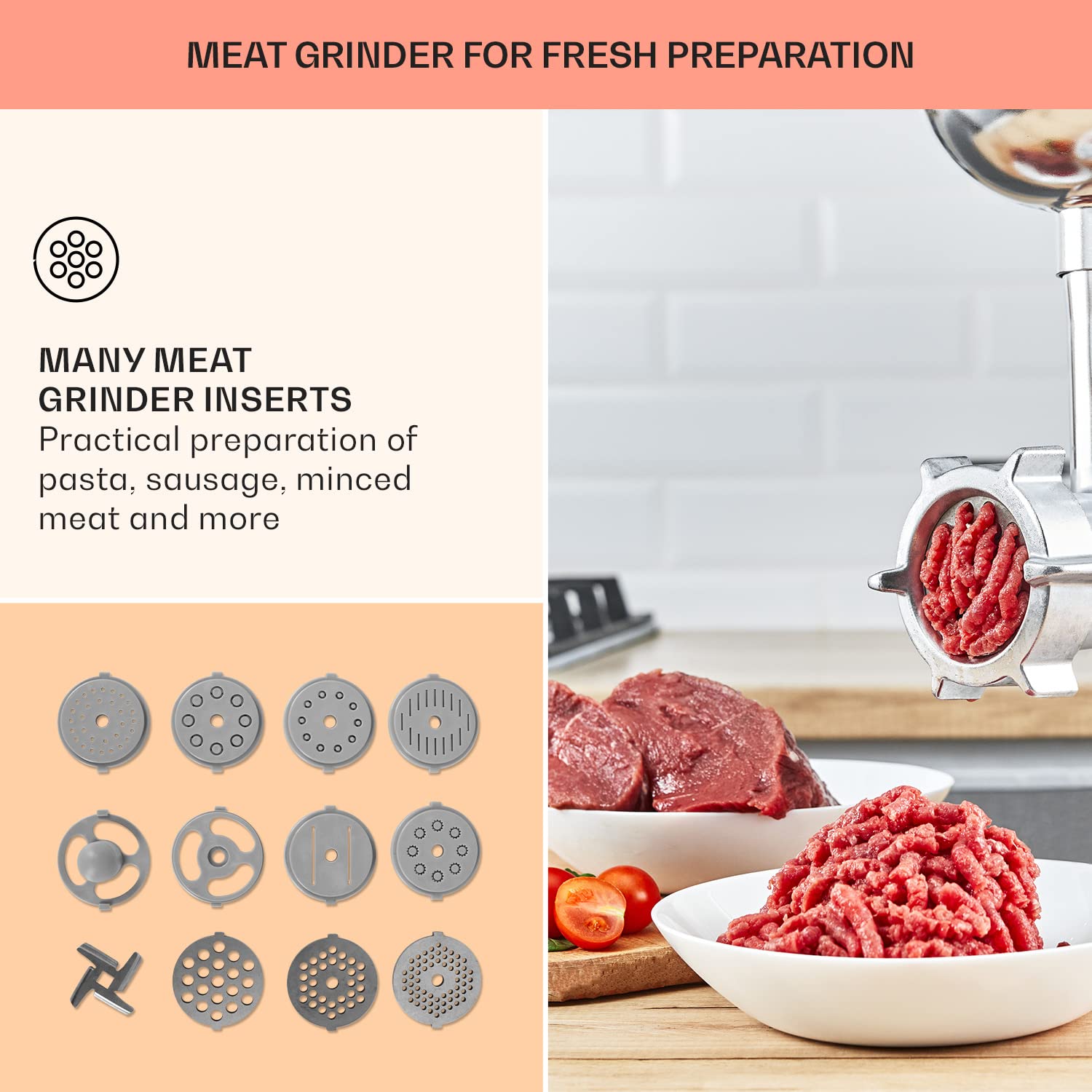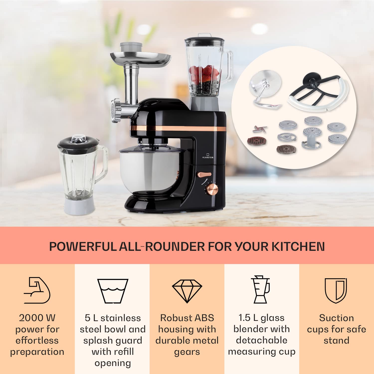 - MULTI-TALENT: The Klarstein Lucia Elegance 3-in-1 food mixer is the all-rounder for the kitchen: mixer for kneading, blending or whipping, blender for chopping and blending and meat grinder for making fresh mince, homemade sausage or pasta.
