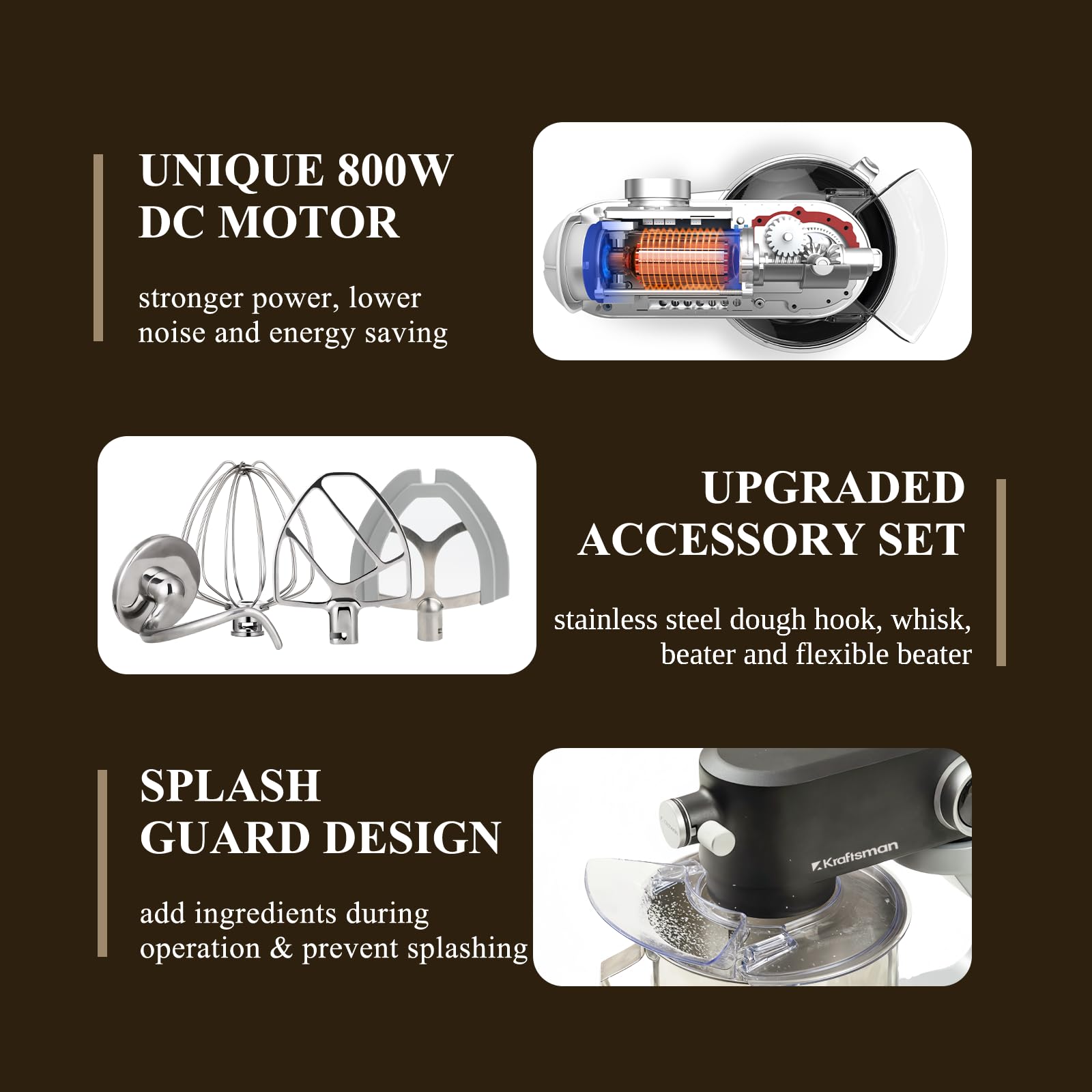 - Every Detail Designed for Your Convenience: Compact design for more space-saving and easy to store. Unique 800W DC motor provides stronger power with lower noise. One-click to lift up the head design makes baking a breeze. Splash guard to prevent splashing