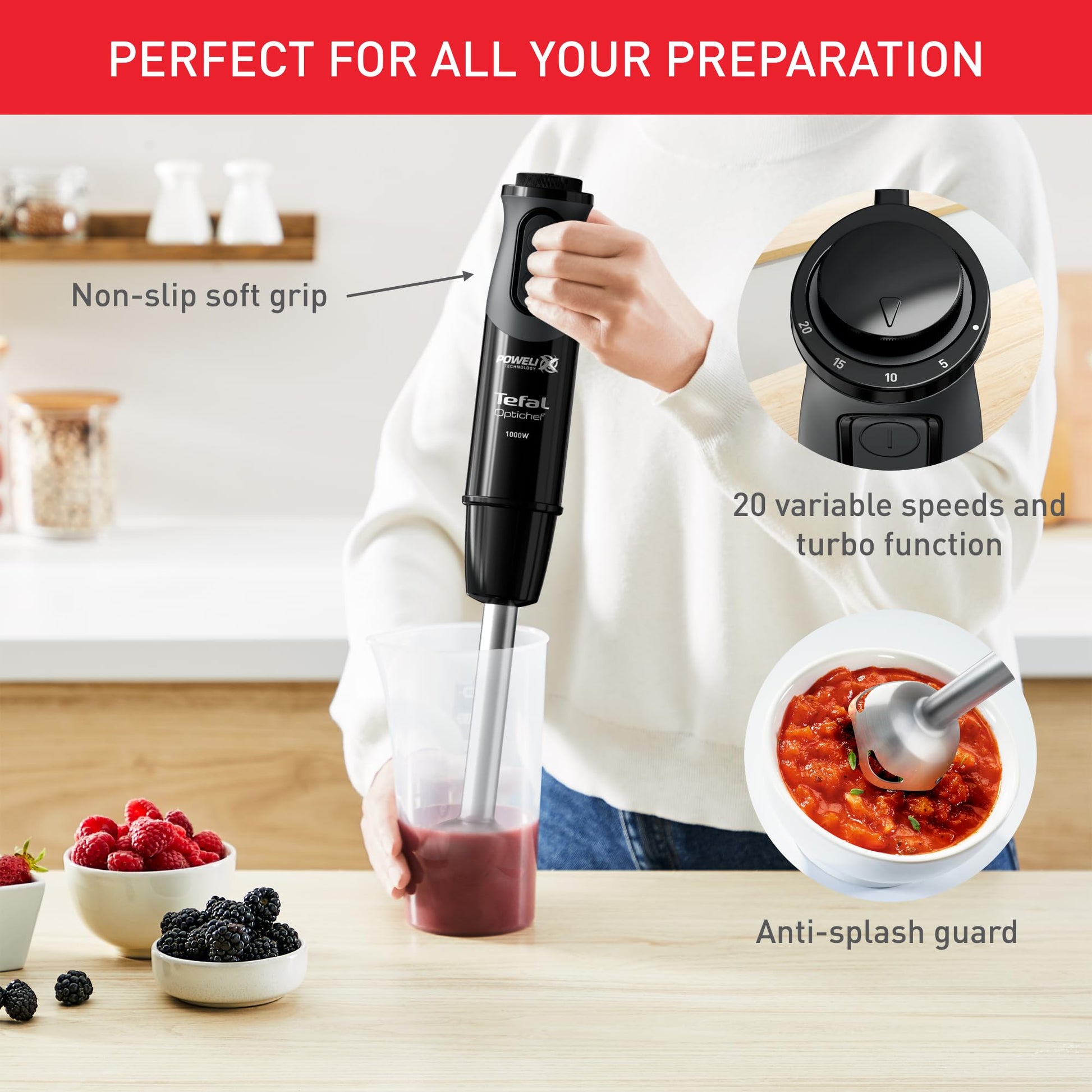 - CUSTOMIZED BLENDING: Hand blender with 20 variable speeds and turbo function, for intuitive speed adjustment at any moment via an easy-to-use dial or the dedicated turbo button